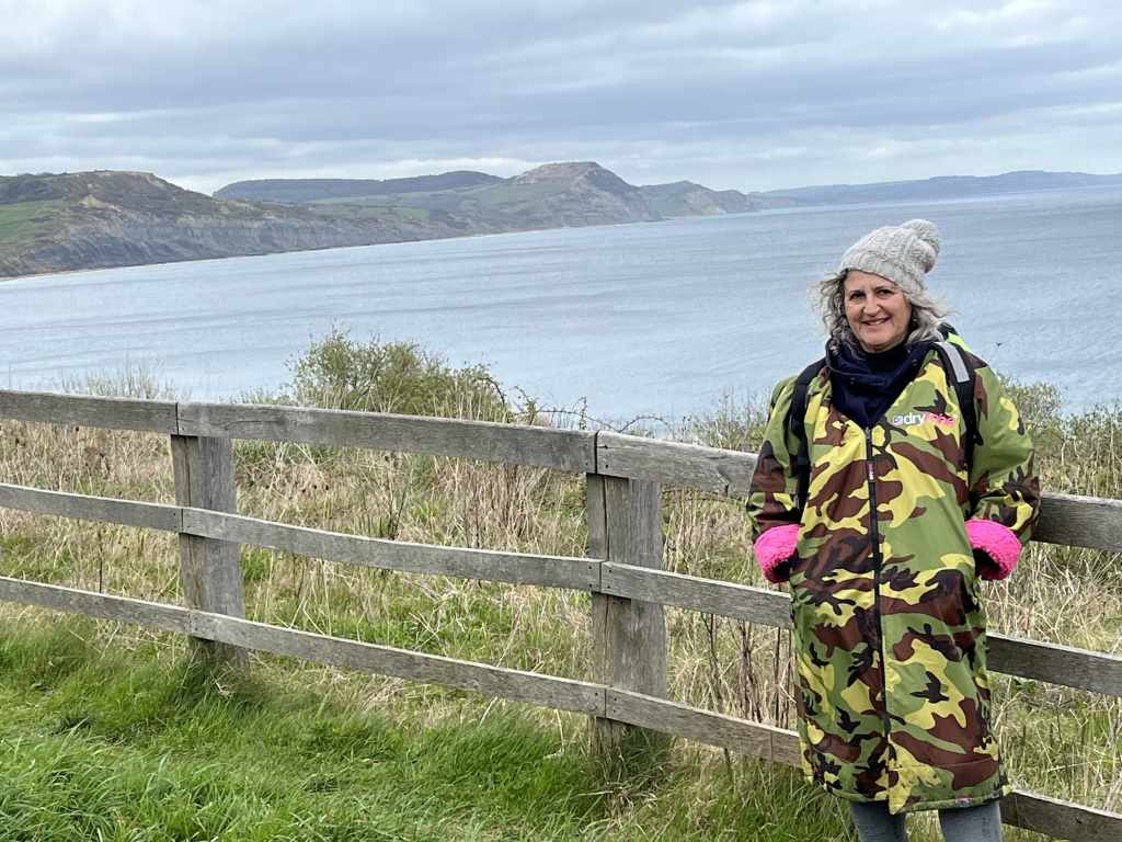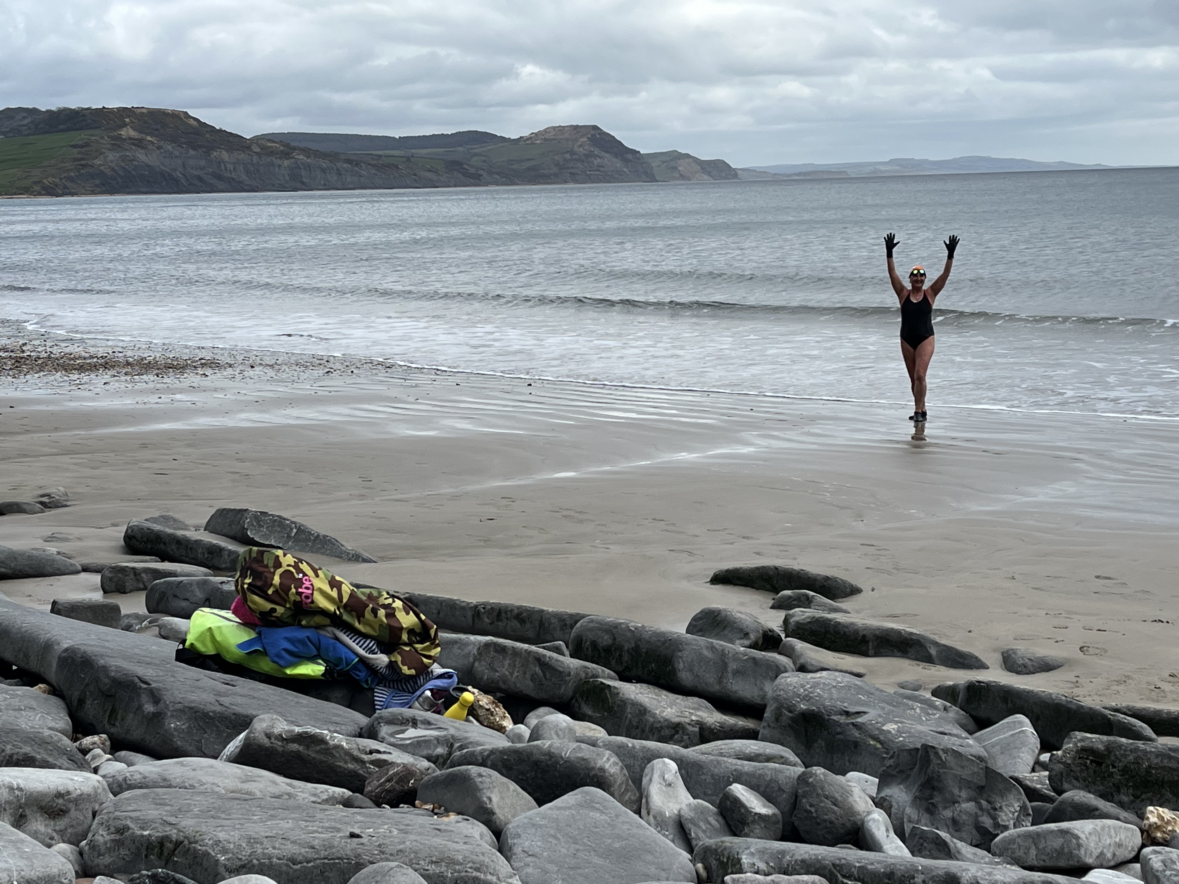 Here I am in Dorset, Lyme Regis on the way to my long awaited swim. It was a lovely sandy beach, I’m used to pebbles in Brighton and Hove . I’m also used to being surrounded by lots of swimmers! Well it’s fair to say the beach was busy with lots of people looking for fossils. No swimmers at all!