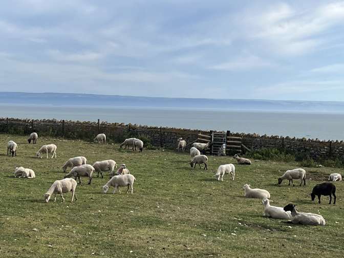 We found a place to stay from the Park 4 the Night app. It was a few miles from Ogmore by sea at a place called Southerndown. It was high up and had great views of the sea and the coves. Our neighbours in the field next to us were sheep. Here’s our view.