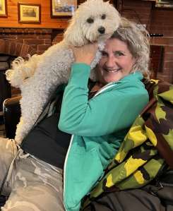 We spent the evening chatting to a couple and ended up having three drinks! Here’s a photo of me with their dog .