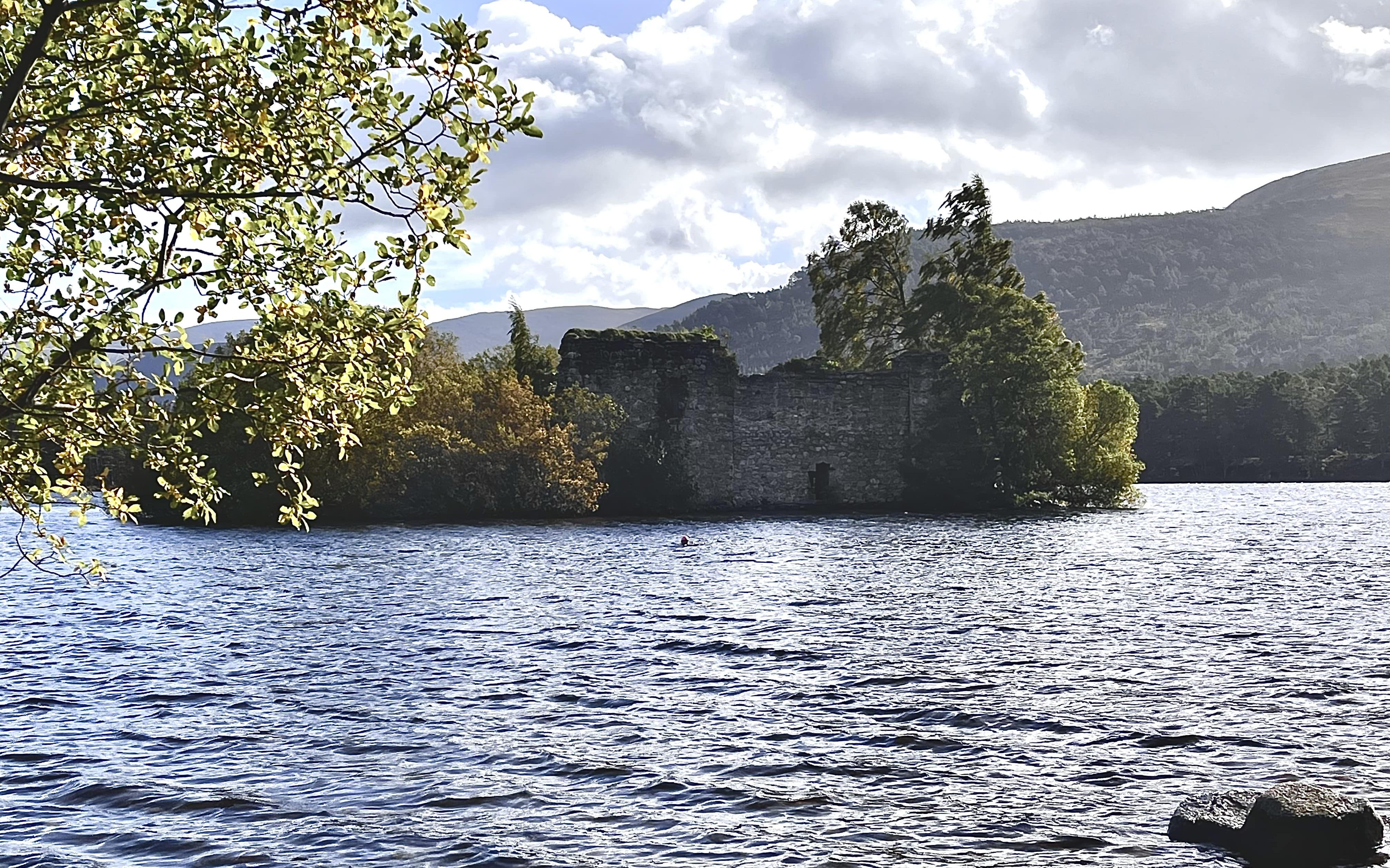 We left Loch Ness and headed to Cairngorms National Park. Julie, Dee’s cousin’s wife back in Hamilton had recommended two different lochs, Loch Morlich and Loch en Eilein. We decided not to do both as we were just passing through on our way back to Hamilton and I would only swim at one of them. I chose Loch en Eilein as there is a castle at the Loch, in the middle of an Island! It’s a natural water loch and the castle is ruins from the 14th century. It is said to have been a refuge from thieves and threatening activities!