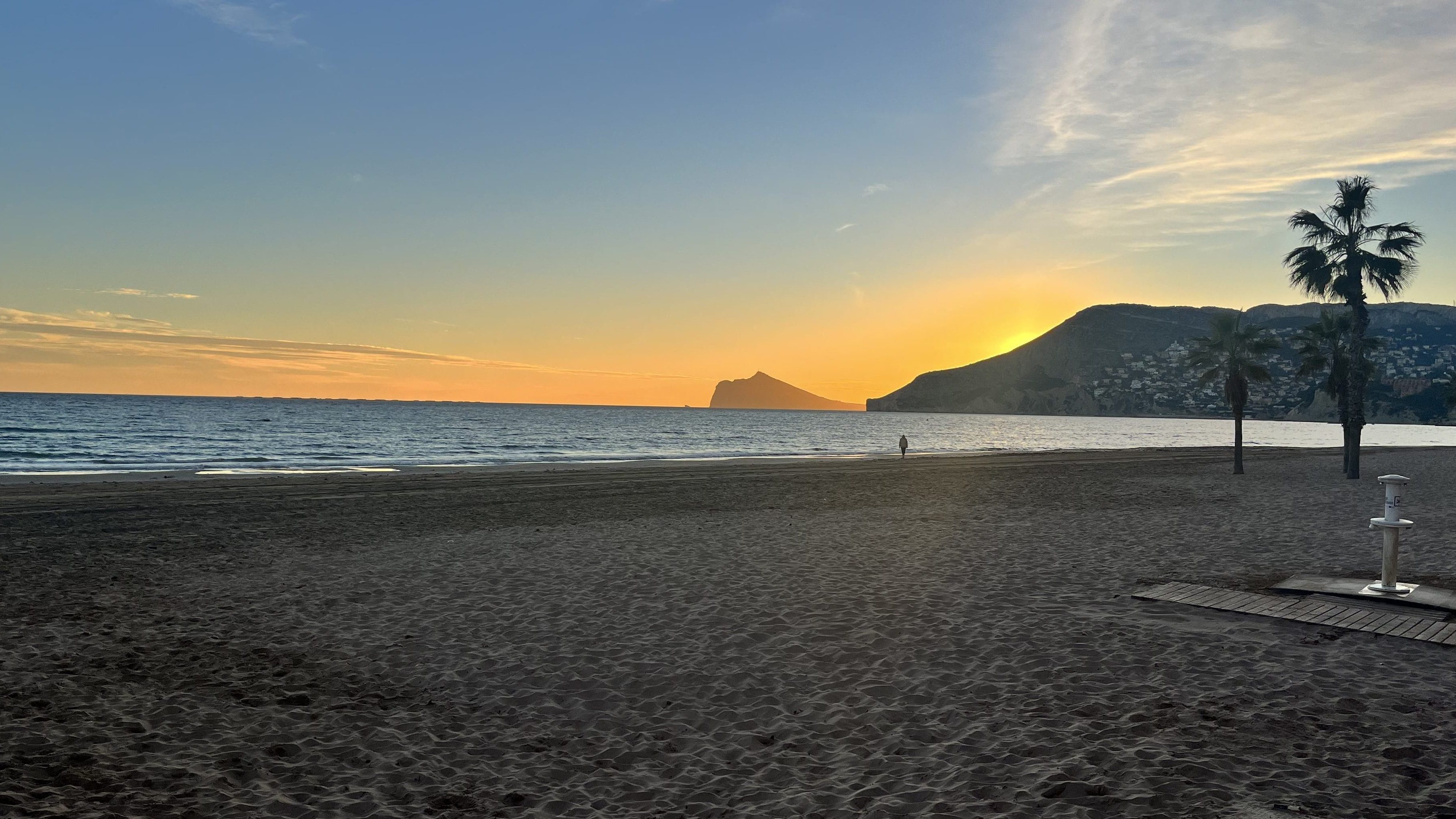 It seemed that parts of Calpe didn’t want Motorhomes parked up! We did find a park up tho that was about a 5 minute walk from the beach. Perfect. I went for a swim then found a nice beach bar/restaurant where I had an excellent seat in the sun so I had some wine and read my book, soon Dee came to join me and we had some tapas as well. Here’s the beach at sunset