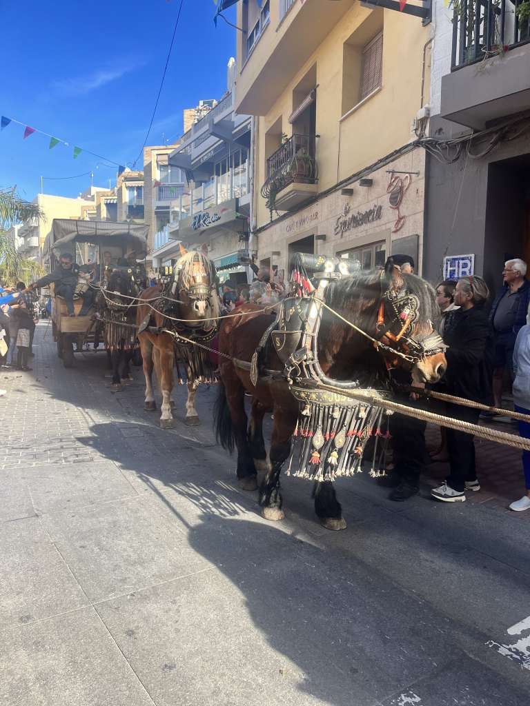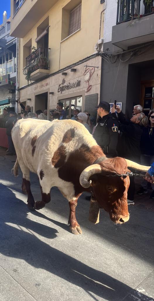 What a welcome! We arrived at Moraira to find there was a parade of some kind going on. Crowds of people watching and waiting. The first part we saw was horses and carriages and then bulls .