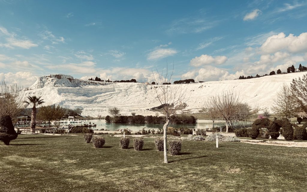 Pamukkale means cotton castle in Turkish. The area is famous for carbonate mineral left by flowing water and it is calcium that makes it look so white.