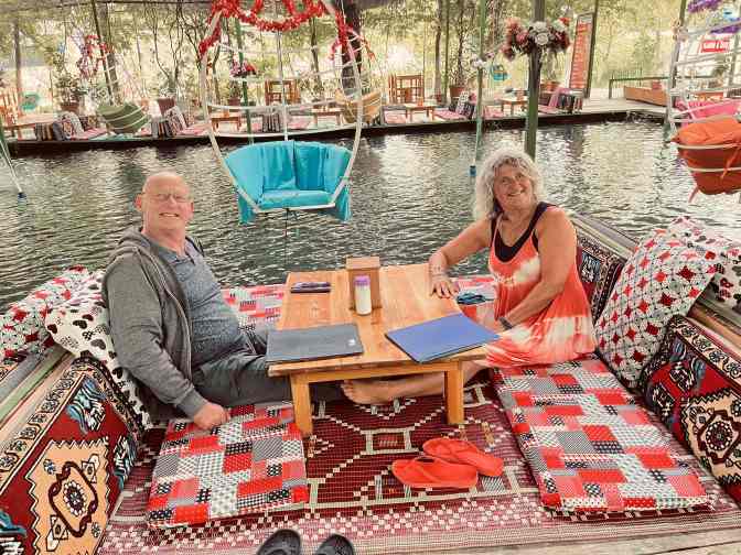 The restaurant was one of many there that had low tables and cushions to sit on . It also had water in the middle and swinging chairs. Here we are below waiting for our dinner .