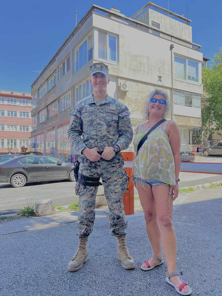 The two photos of Dee at the bottom are in the streets around Sarejevo .