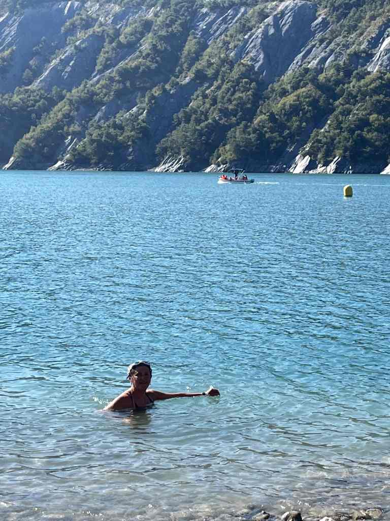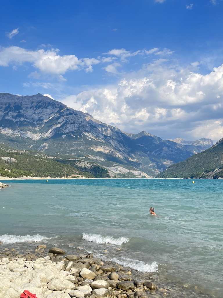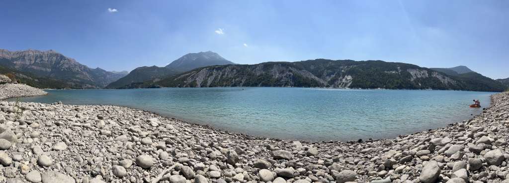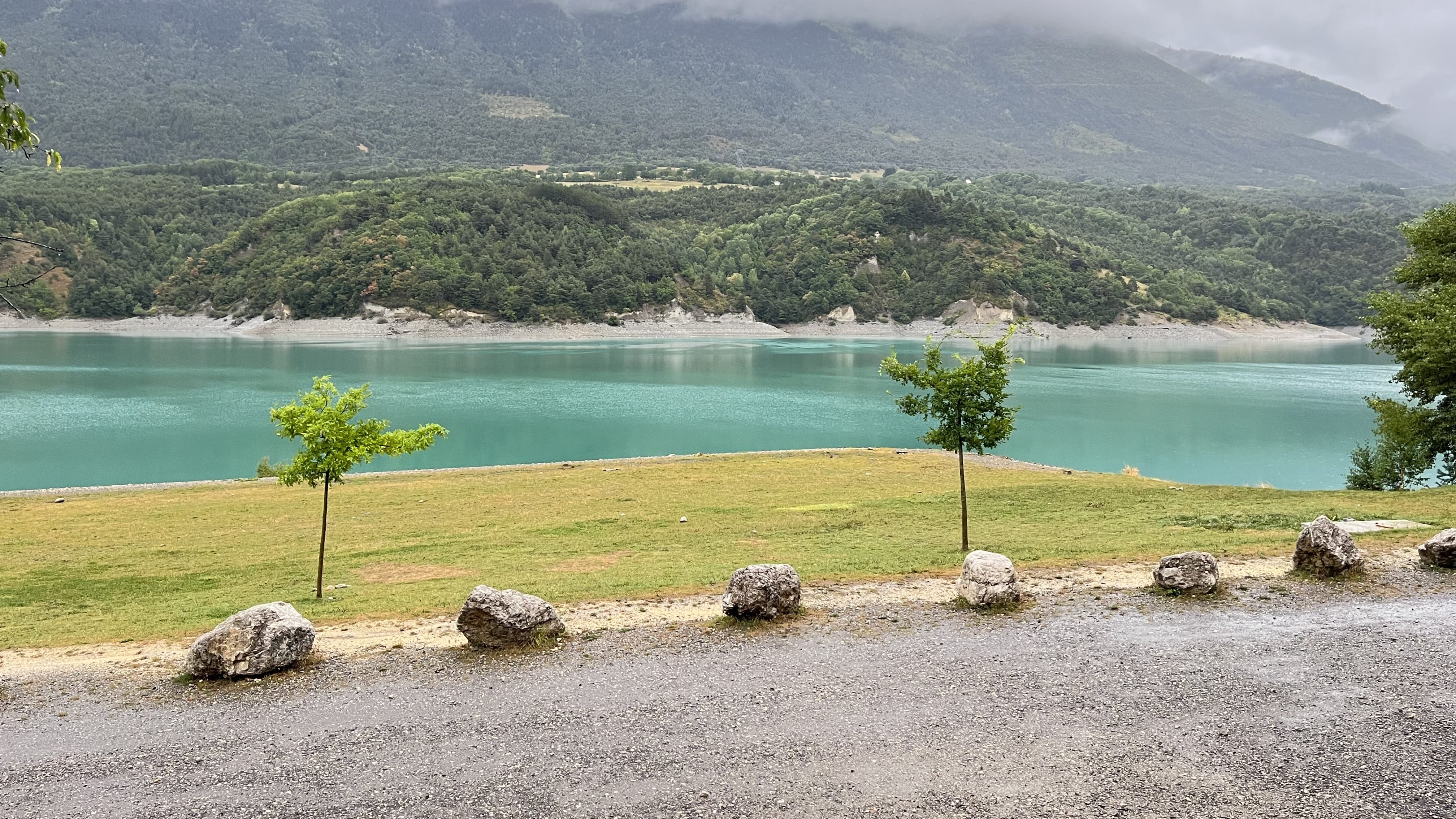 Lac de Serre-Ponçon is located in the French Alps so we were hoping it would be a little cooler . It is one of Europe’s largest artificial lakes, created by damming the Durance River and the Ubaye River. Completed in 1961, this impressive reservoir spans 28.2 square kilometers and holds up to 1.27 billion cubic meters of water, playing a crucial role in flood control, hydroelectric power generation, and irrigation.